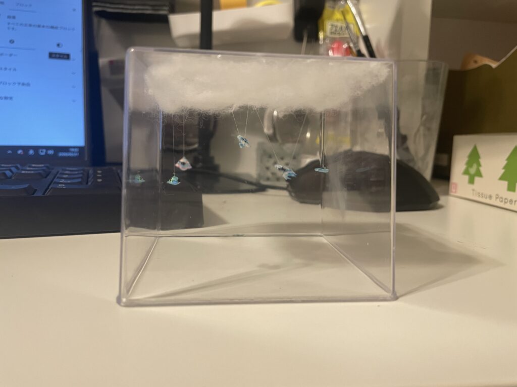 乗り物を糸で雲から吊る際に使用した糸もアリエクで購入しました。マジシャンがマジックを披露する際に使うという、人の目には見えない糸「インビジブルスレッド」というやつです。1/3000という極小世界ではちょっぴり存在感を出してきます。