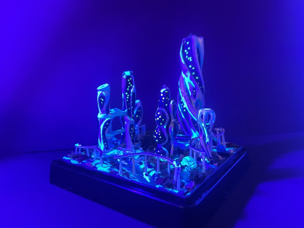 タワーの側面や水脈、そして地表の鉱石や植物たちが、一斉にまばゆい光を放ち始めます。暗闇の中に浮かび上がる青と緑のネオンサインのような発光は、幻想的でありながら、どこかサイバーパンク的な冷たさも併せ持っています。