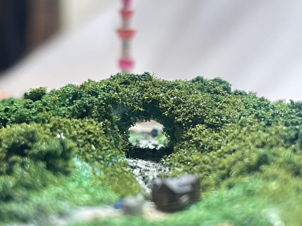 ただ、やはりそれはかな~り難易度が高く、細かい集中力と時間を要す作業になりそうだということで断念しました。代わりに、トンネル状の穴をジオラマの中央に形成することで、一応やってみたということにしておきます。