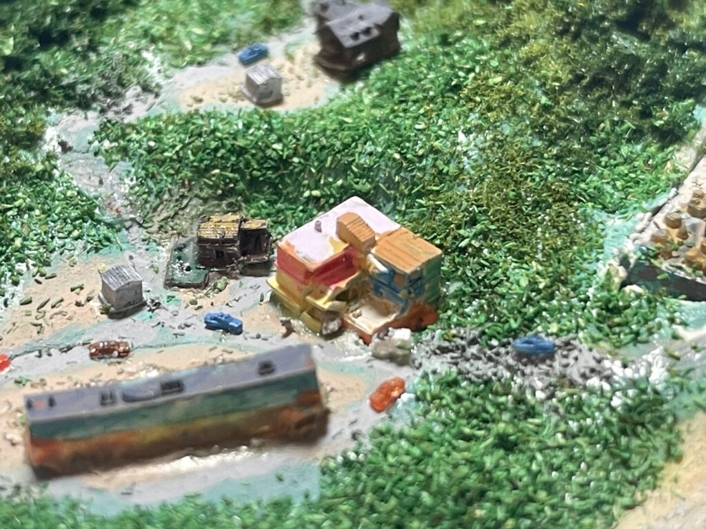 - 多色塗りの発見: 軽トラックや輸送船の荷物、中南米特有のカラフルな民家など、多色塗装がかなり気持ちよく決まった。現実感がないと感じる色には、黄色を混ぜるとなぜかいい感じになった。